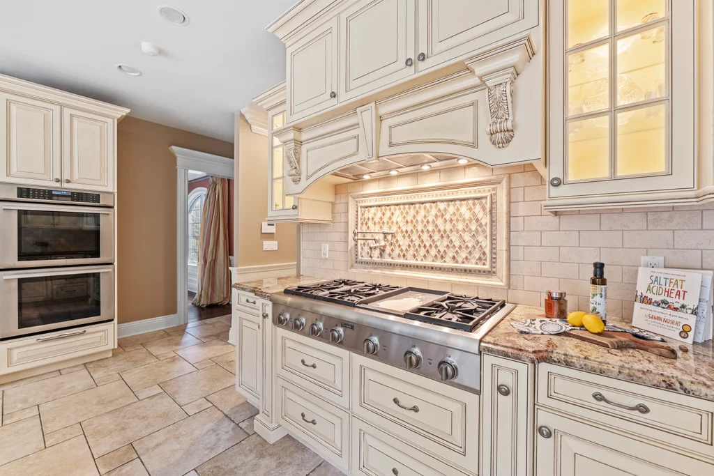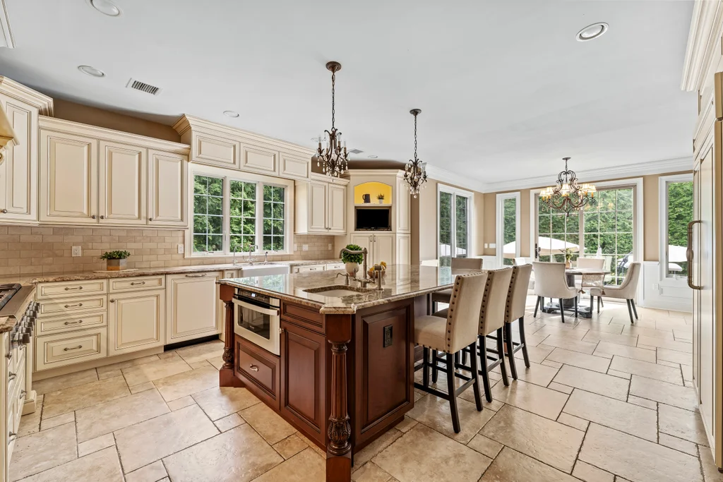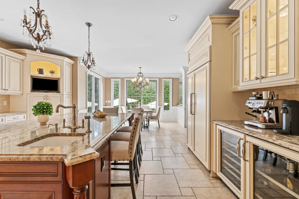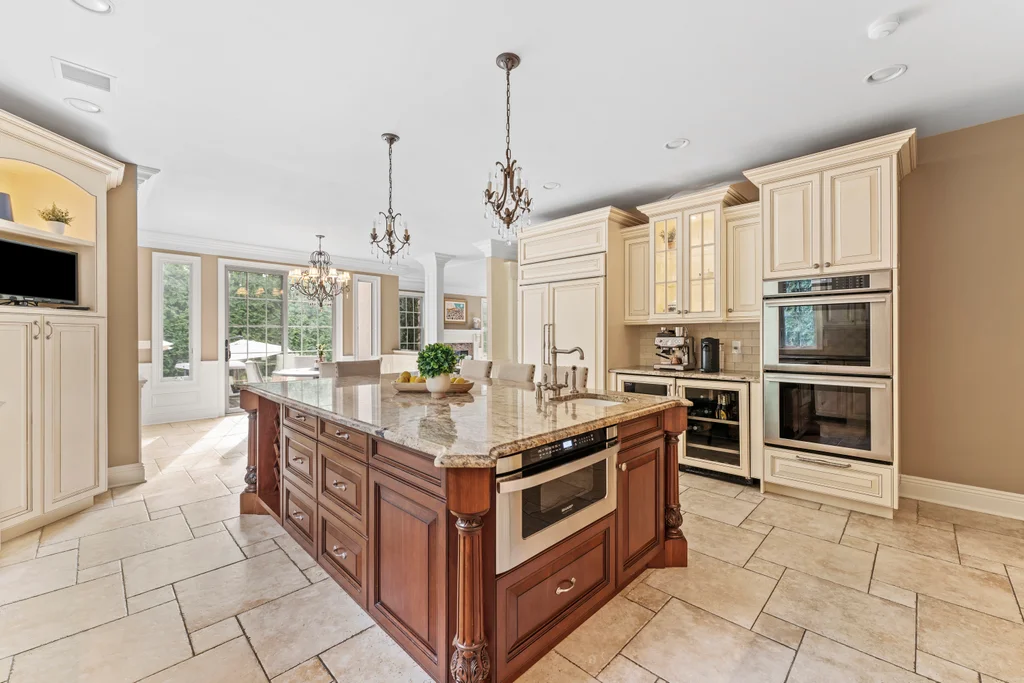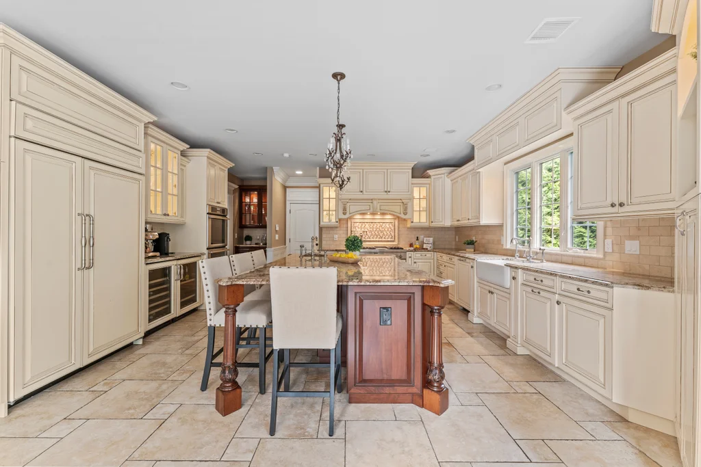 The chef’s kitchen is a true centerpiece, appointed with a 48” Sub-Zero refrigerator, a double Thermador oven, a 48” cooktop with pot filler, and refined finishes designed for culinary excellence. A two-car garage conveniently opens on grade to the kitchen, enhancing everyday functionality.