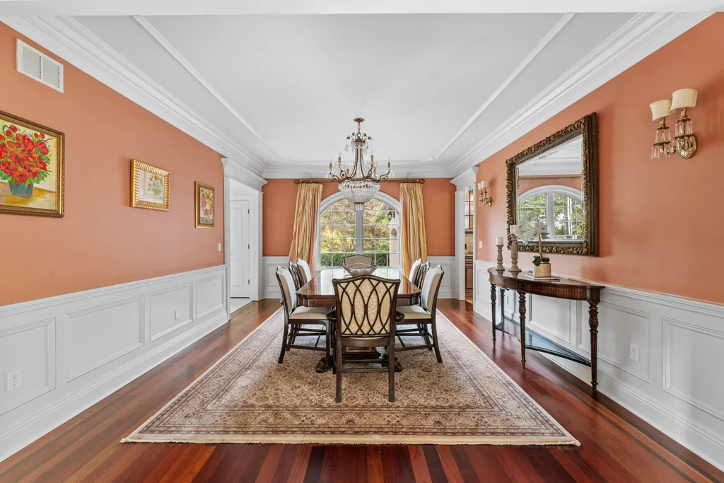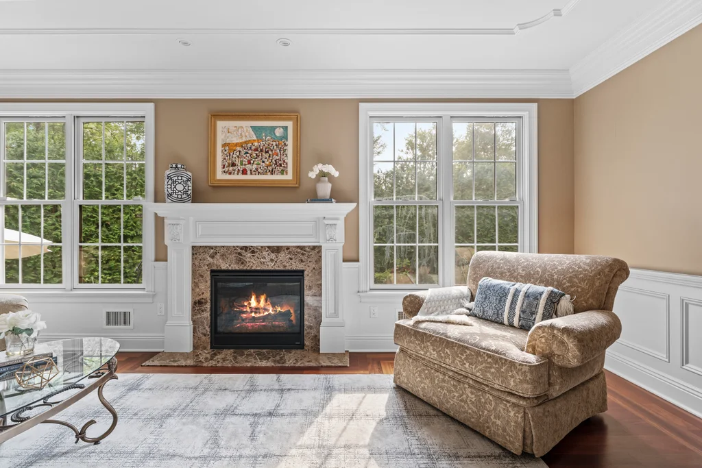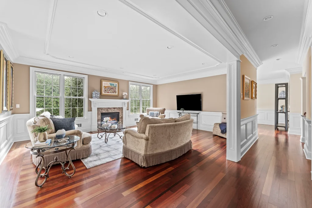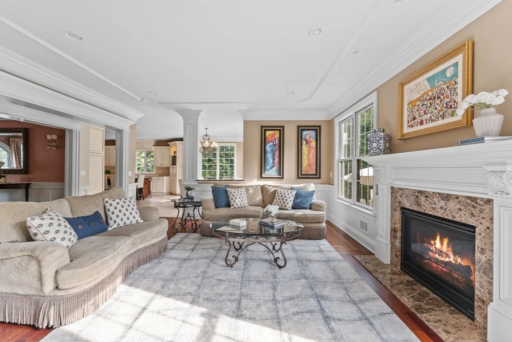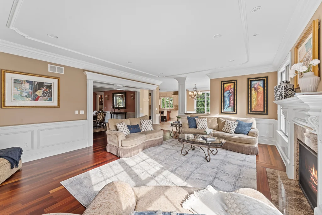 Inside, graciously sized rooms flow seamlessly, featuring Brazilian Cherry hardwood floors, deep crown moldings, and extensive custom millwork throughout. Oversized Andersen windows bathe each space in natural light, while soaring ceilings create an open, airy atmosphere that elevates every living area. The family room offers a welcoming fireplace, ideal for both intimate evenings and elegant gatherings.