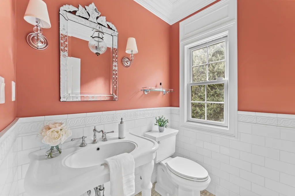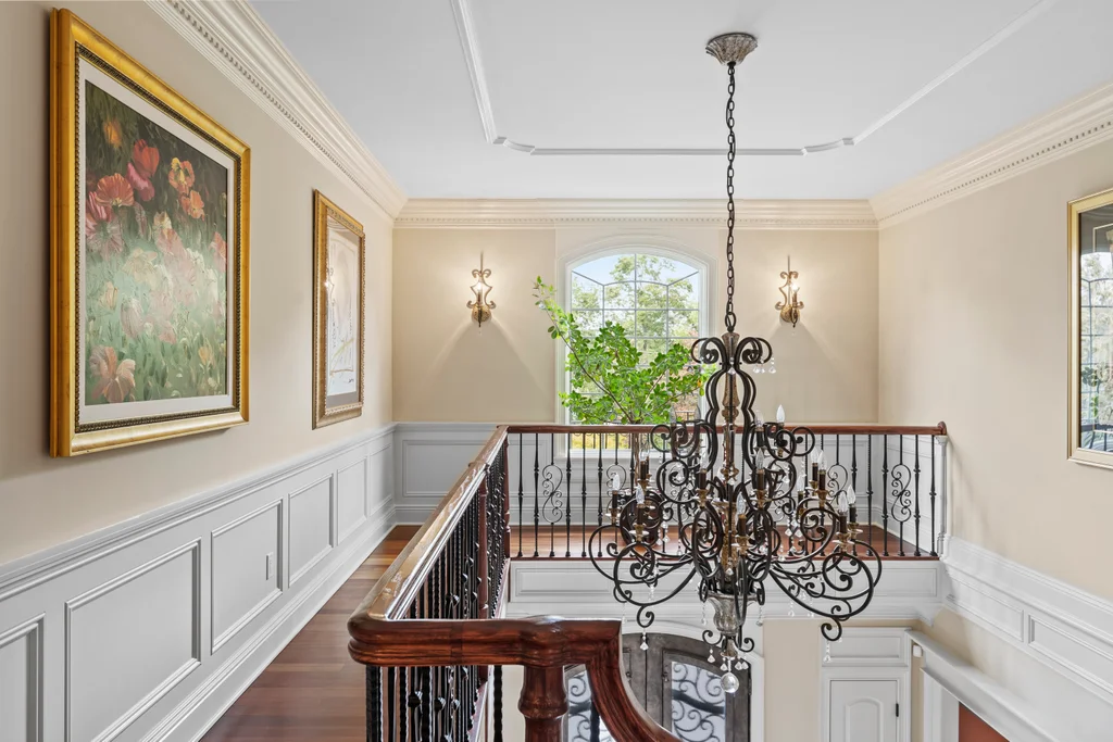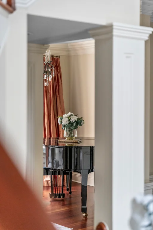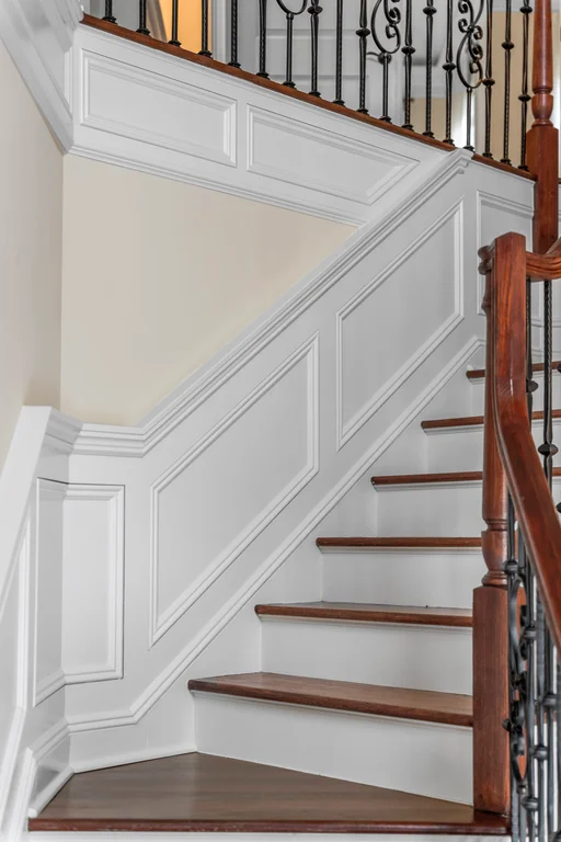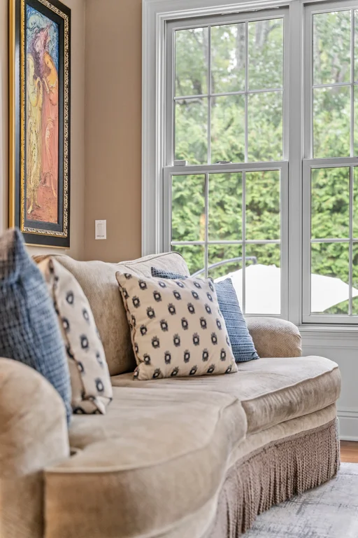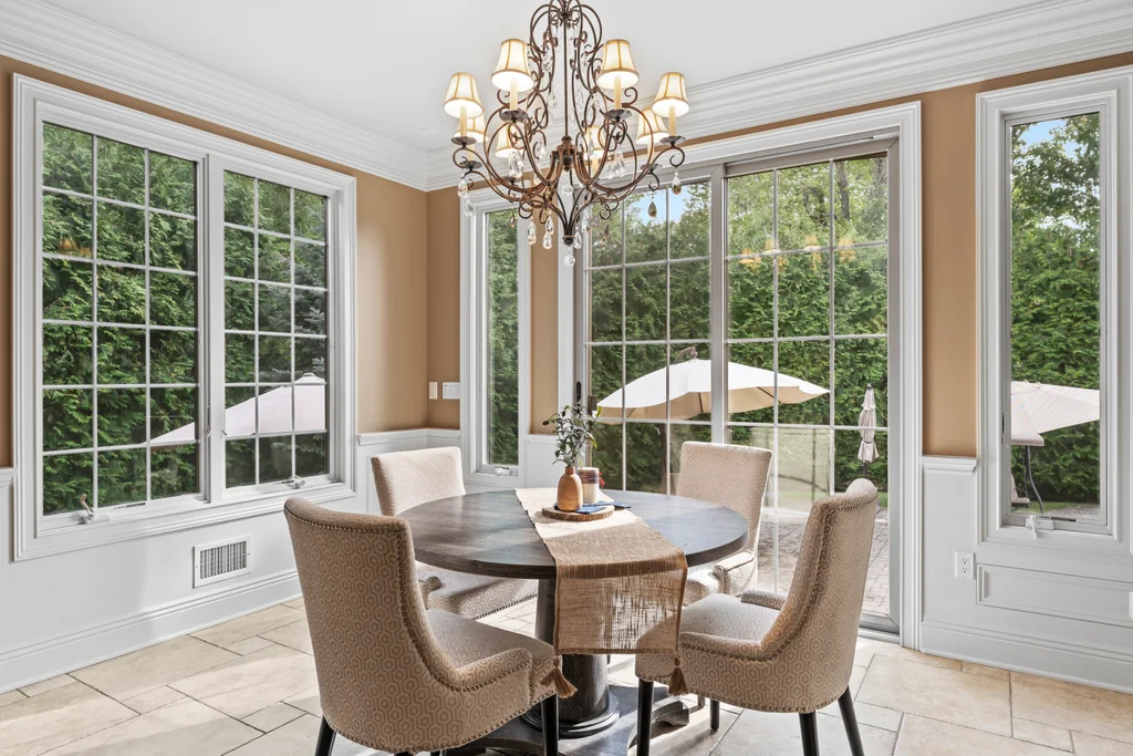 Inside, graciously sized rooms flow seamlessly, featuring Brazilian Cherry hardwood floors, deep crown moldings, and extensive custom millwork throughout. Oversized Andersen windows bathe each space in natural light, while soaring ceilings create an open, airy atmosphere that elevates every living area. The family room offers a welcoming fireplace, ideal for both intimate evenings and elegant gatherings.