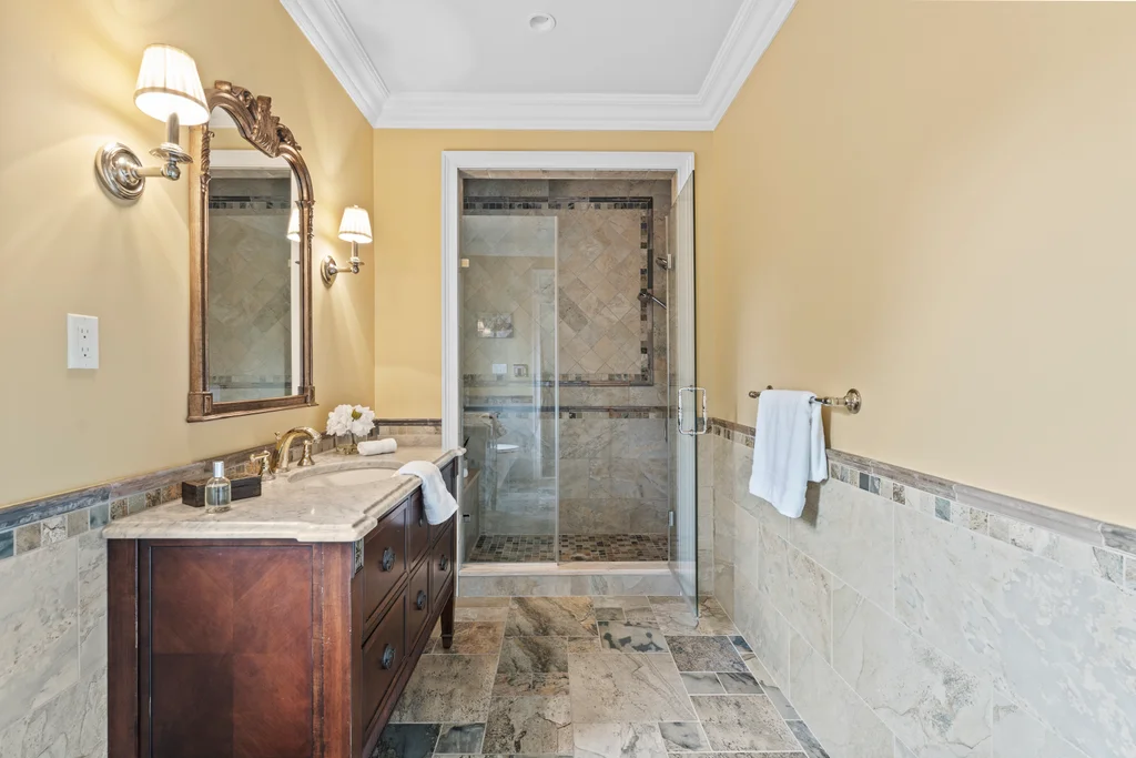 Upstairs, the luxurious primary suite is an extraordinary retreat, featuring a tray ceiling, a private seating area with a gas fireplace, abundant closet space, and a spa-like bath with radiant heated floors. All three second-floor bathrooms are equipped with heated flooring, ensuring comfort year-round.
